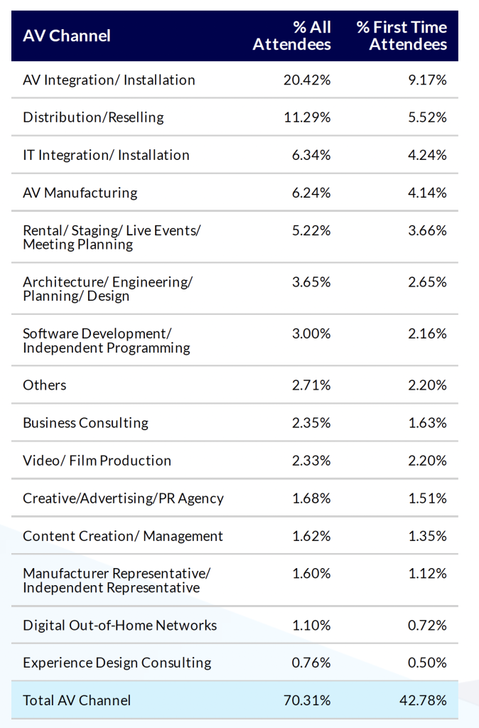Per quanto riguarda invece, nello specifico, i partecipanti che lavorano nel settore AV (il 70% di tutti i partecipanti a ISE 2024), i dati raccolti ci dicono, in linea con le aspettative, che le percentuali maggiori sono per le occupazioni: integrazione/installazione AV (20,42%, di cui 9,1%), distribuzione/rivendita (11,3%), integrazione/installazione IT (6,3%), produzione AV (6,2%) – Figura 6.