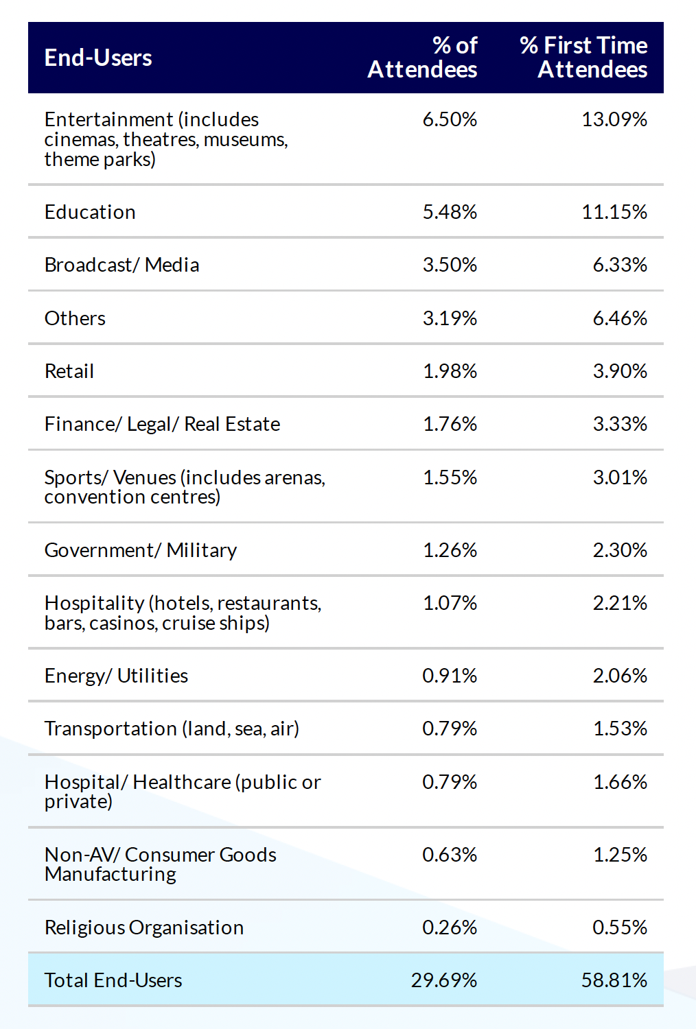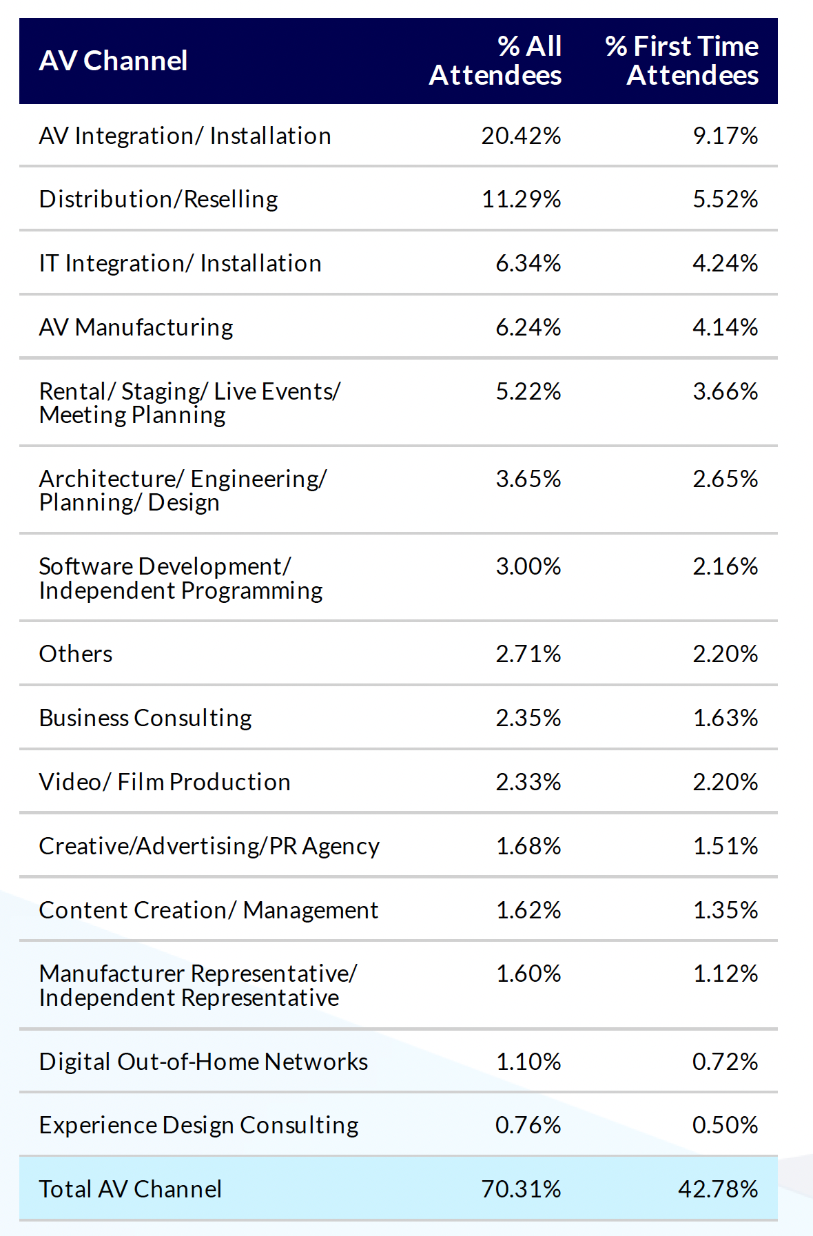 Per quanto riguarda invece, nello specifico, i partecipanti che lavorano nel settore AV (il 70% di tutti i partecipanti a ISE 2024), i dati raccolti ci dicono, in linea con le aspettative, che le percentuali maggiori sono per le occupazioni: integrazione/installazione AV (20,42%, di cui 9,1%), distribuzione/rivendita (11,3%), integrazione/installazione IT (6,3%), produzione AV (6,2%) – Figura 6.
