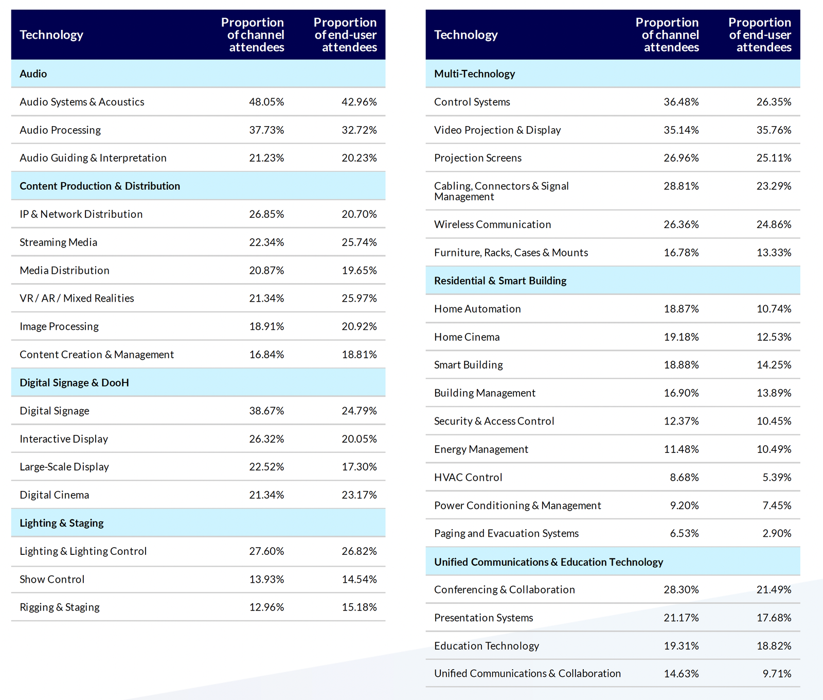 Per quanto riguarda le tecnologie di interesse (ovvero quelle che vengono segnalate come di interesse dai visitatori), si rimanda alla Figura 7; ci limitiamo qui a sottolineare la percentuale più alta indicata sia dal canale che dagli utenti finali, ovvero Audio Systems & Acoustics, rispettivamente 48% e 42%), seguita per il canale da Digital Signage (38%) e per gli utenti finali da Video Projection & Display (ritenuta interessante dal 35% dei rispondenti).
