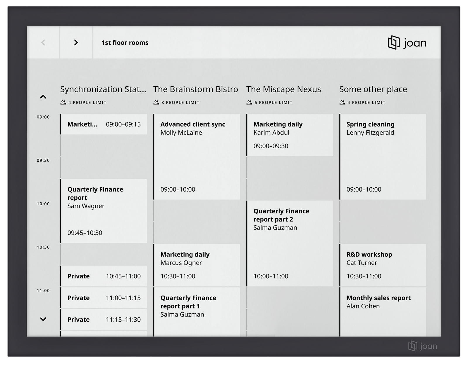 Joan Workplace è una piattaforma completa, flessibile e all-in-one per la prenotazione di sale riunioni, scrivanie e asset, la gestione dei visitatori e molto altro. Utilizza una app desktop e mobile, le risorse già presenti in Google Workspace, Office 365 e Teams, i display touch e-paper Joan e/o i tablet di terze parti.