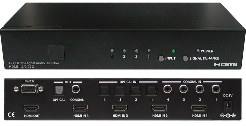 Un accessorio utile per inviare ad un televisore, o videoproiettore, una delle quattro sorgenti collegate in HDMI. Il CT215, ai 4 ingressi HDMI aggiunge anche gli ingressi digitali ottici (Toslink) e coassiali, per ogni ingresso. Lo stesso discorso vale anche per l’uscita. Viene assicurata la compatibilità con la versione 1.3 dello standard HDMI (larghezza di banda pari a 2,25 Gbps) e 1.1 dell’HDCP. Il frontale ospita i led che indicano quale ingresso è stato selezionato, e due pulsanti: il primo per commutare gli ingressi (in alternativa è possibile farlo con il telecomando in dotazione), e il secondo per migliorare la qualità del segnale HDMI e renderlo più robusto e affidabile. Il CT215 supporta segnali video con Deep Color a 16 bit e audio Dolby TrueHD e Master Audio DTS-HD. L’interfaccia seriale RS-232 consente il controllo in un sistema integrato, anche via PC. L’alimentatore esterno è da 5 Vc.c.