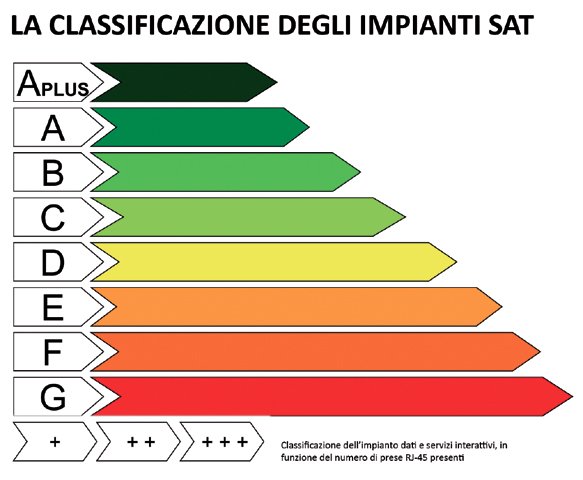 Nella tabella qui sotto sono riportate le classi dell’impianto sat, dalla A Plus alla G, in funzione del numero di prese e della tipologia dell’impianto, con un’appendice dedicata alle prese dati per accedere ai servizi interattivi.