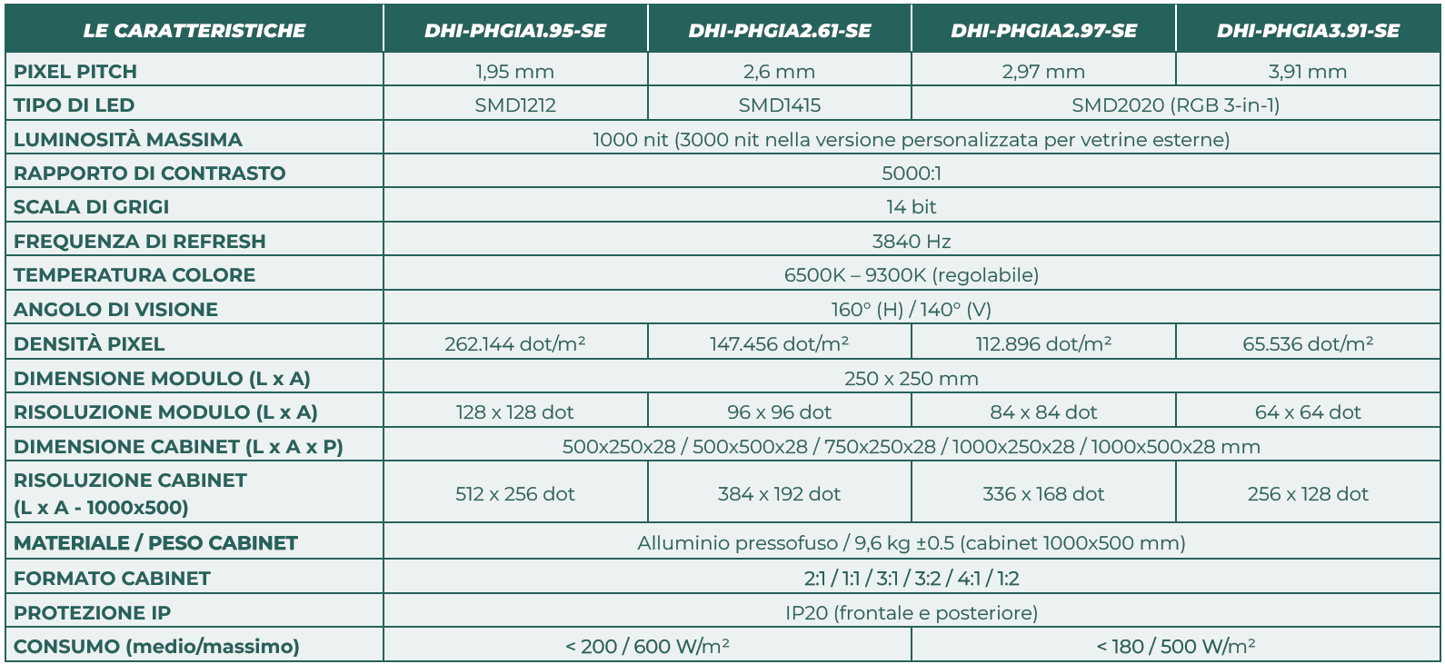 Il modulo DHI-PHGIA1.95-SE con dot pitch da 1,95 mm impiega LED SMD 1212; il DHI-PHGIA2.61-SE (2,6 mm) integra chip 1415, mentre le altre due varianti (DHI-PHGIA2.97-SE da 2,97 mm e DHI-PHGIA3.91-SE da 3,91 mm) utilizzano chip 2020.