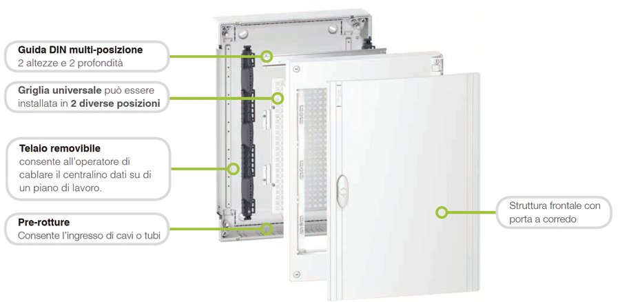 La serie Pragma, disponibile nelle versioni da incasso e da parete, conferma la qualità estetica che distingue il centralino MiniPragma. Lo spazio a disposizione è pari a 13 oppure 18 moduli su 3 file, adeguato per realizzare un QDSA completo di un maggior numero di device, rispetto a quanto è possibile fare con un centralino MiniPragma. Due i principali vantaggi per l’installatore, che gli consentono di velocizzare il lavoro: la modalità di assemblaggio del centralino Pragma, analoga a quella del MiniPragma e la possibilità di utilizzare gli stessi accessori.