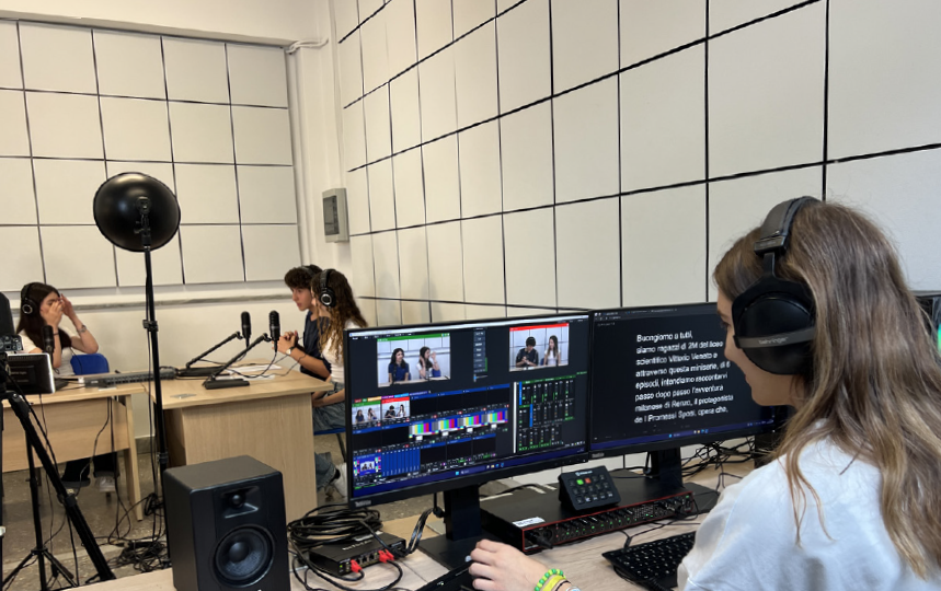 Sull’uso delle dotazioni dell’istituto Vittorio Veneto ci dice qualcosa il professor Dimondo: «Abbiamo due aule adibite a laboratorio: uno prettamente audiovisivo per i podcast e uno solo per le riprese video e la proiezione degli elaborati. Avendo anche un laboratorio di chimica e uno di fisica, abbiamo optato per dotarci anche dell’unità mobile, che con la stessa rete ci permette di spostarci all’interno della scuola e registrare una conferenza in auditorium, realizzare un video-tutorial di un esperimento in uno dei laboratori o mandare una diretta streaming dall’osservatorio. Al momento abbiamo due camere PTZ, entrambe trasportabili, ma confidiamo di poter implementare ulteriormente questi laboratori a mano a mano che crescerà la consapevolezza delle opportunità che questo tipo di didattica può offrire».