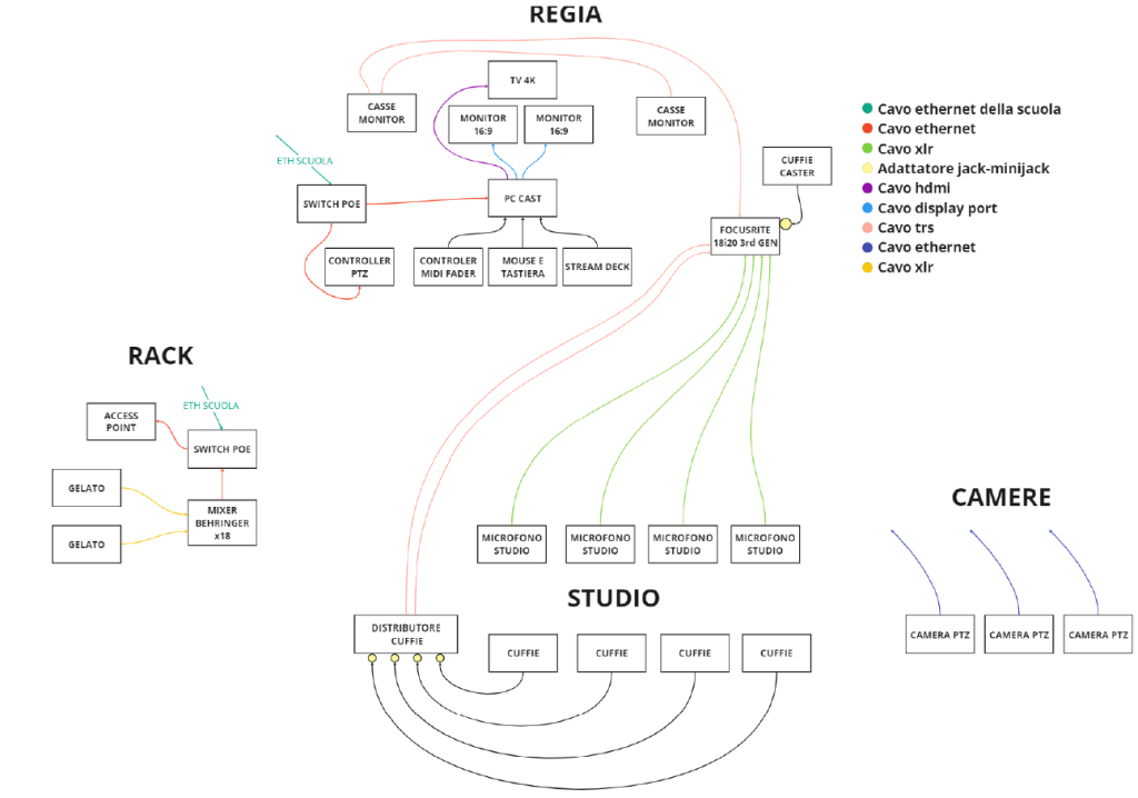Nel caso del Giordano Bruno, la scelta è stata di usare lo studio o l’aula magna – il maggior punto di interesse per le loro attività, non troppo distante dallo studio e dalla regia – in modo alternato: i ragazzi useranno frontalmente la regia per registrare podcast e fare radio o, in alternativa, useranno l’unità mobile portandola nell’aula magna per riprendere gli eventi, spostando anche le videocamere e fornendo i microfoni ai relatori.