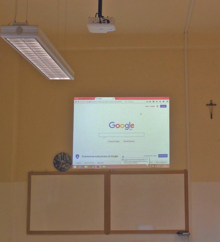 Ce lo racconta nel dettaglio Claudio Emiliani: «I responsabili della scuola, per scelta, non gradivano l’impiego all’interno dell’istituto delle lavagne interattive. Non solo, per specifiche esigenze formative, pur volendo servirsi di strumenti tecnologici, hanno preferito non stravolgere l’allestimento interno delle aule. Pertanto, disponendo di abbondante spazio in altezza, hanno scelto di mantenere nella posizione originale le lavagne classiche e, essendo molto alto il soffitto (4,40 m), hanno richiesto una soluzione che permettesse di proiettare direttamente sull’area della parete al di sopra delle lavagne. Fin qui – prosegue Emiliani – la scelta poteva risultare consueta, a meno di una problematica emersa in fase di valutazione dei videoproiettori da impiegare. Dovendo essere posizionati molto in alto, infatti, non è così semplice garantirne la manutenzione, anche solo quella ordinaria della pulizia dei filtri o l’eventuale sostituzione di una lampada. Ogni intervento dovrebbe essere fatto previo utilizzo di un cestello di sicurezza, da montare e smontare in aula per consentirne l’accesso attraverso la porta d’ingresso. Da lì, la scelta logica è stata quella di affidarsi ai videoproiettori Casio, che non necessitano di manutenzione e presentano un ciclo di vita del corpo illuminante di 20mila ore. Una volta posizionati, infatti, i videoproiettori Casio godono di un’autonomia di durata talmente lunga, priva di qualsiasi intervento, che la scuola può fare a meno di mettere a budget i costi relativi alla loro manutenzione».