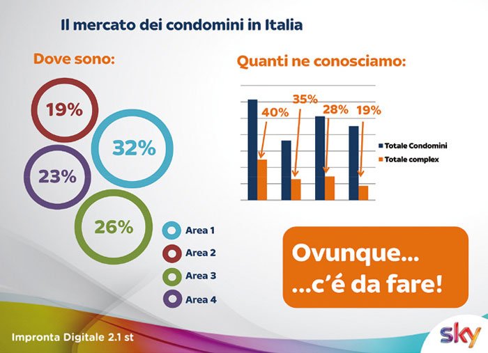 La fotografia attuale del settore residenziale in Italia parla di oltre 12 milioni di famiglie residenti in circa un milione di condomini. Un mercato importante, distribuito in modo omogeneo sul territorio nazionale. Non solo, recenti studi indicano l’Italia come paese nel quale il consumo della televisione è aumentato come in nessun altra nazione d’Europa. In sostanza, siamo il paese europeo che passa più tempo davanti al “piccolo schermo”. Sono dati importanti che danno il senso della potenzialità che un settore come questo può offrire; rappresenta un bacino talmente ampio da risultare in gran parte inesplorato. Ed è questa la nuova sfida raccolta da Sky che tende la mano alla rete degli installatori per supportarli in quello che può essere considerato un nuovo viaggio nella gestione del mercato condominiale.