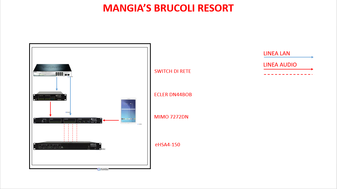 Anche la distribuzione avviene tramite apparecchi Ecler. «Parliamo dei convertitori DN44BOB, un modello in grado di convertire da Dante in analogico e viceversa. Ci siamo occupati di collegare tutto in rete su una WLAN dedicata con una famiglia di indirizzi solo per l’audio. La matrice, i convertitori, otto piccoli pannelli dislocati nelle varie zone del resort per il controllo del volume e degli ingressi sono tutti collegati tramite cavo di rete ai rack delle singole zone, che hanno all’interno uno switch per la gestione dei cavi in fibra ottica, dei convertitori e degli amplificatori dell’area interessata. Una volta che tutte le componenti sono in rete, è sufficiente creare le assegnazioni audio tramite il software Dante Controller e infine creare in EclerNet Manager i comandi per la gestione delle varie zone».