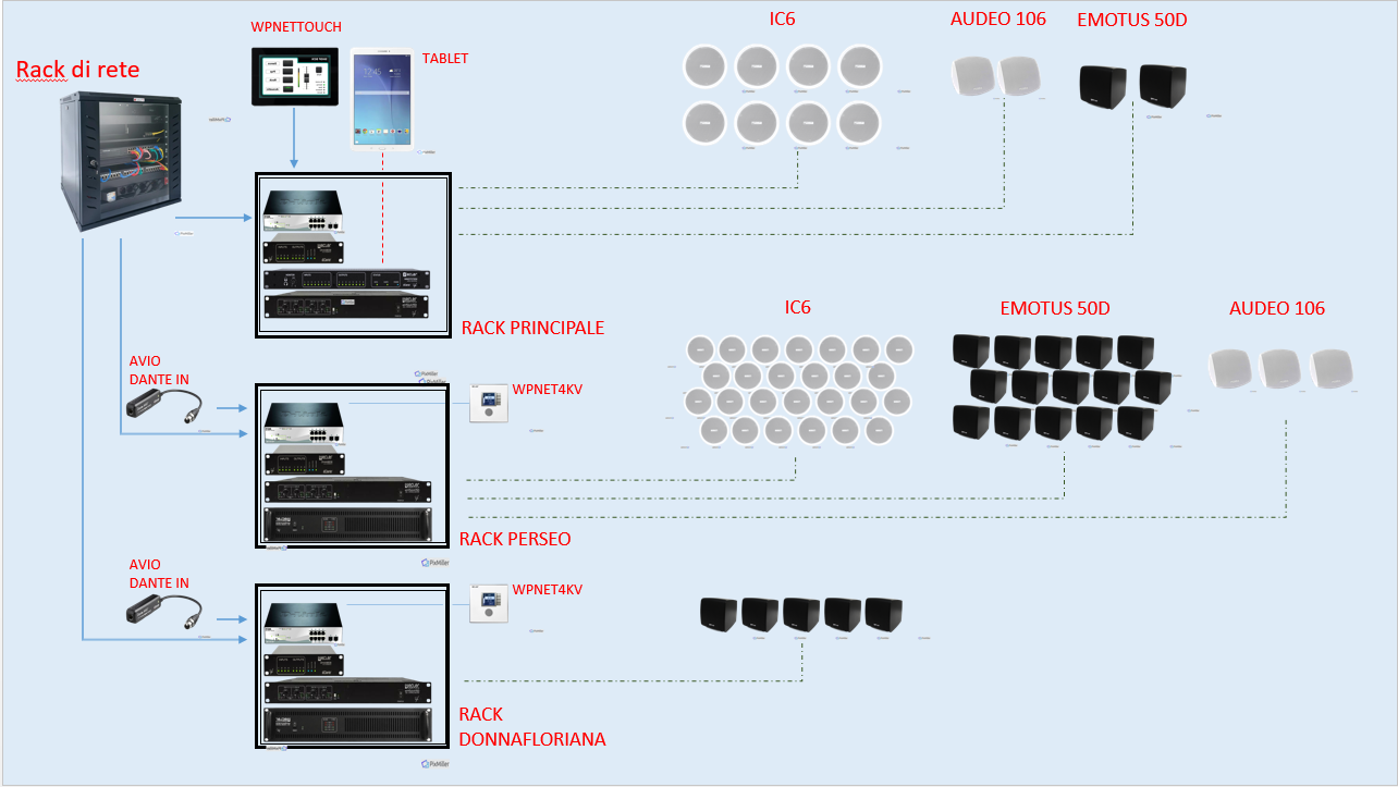 Per arrivare alla realizzazione sono stati necessari molti sopralluoghi, data anche la varietà di situazioni nelle quali ci saremmo trovati a operare. In tutte le zone interessate dall’impianto audio sono stati previsti diffusori ad alta impedenza alimentati a tensione costante, dai 15 W ai 30 W a seconda del modello e della tipologia di installazione. Ciascun diffusore ha almeno venti metri di cablaggio. Abbiamo poi i vari rack, con gli amplificatori e i ricevitori Dante. Insomma, un sistema piuttosto complesso».