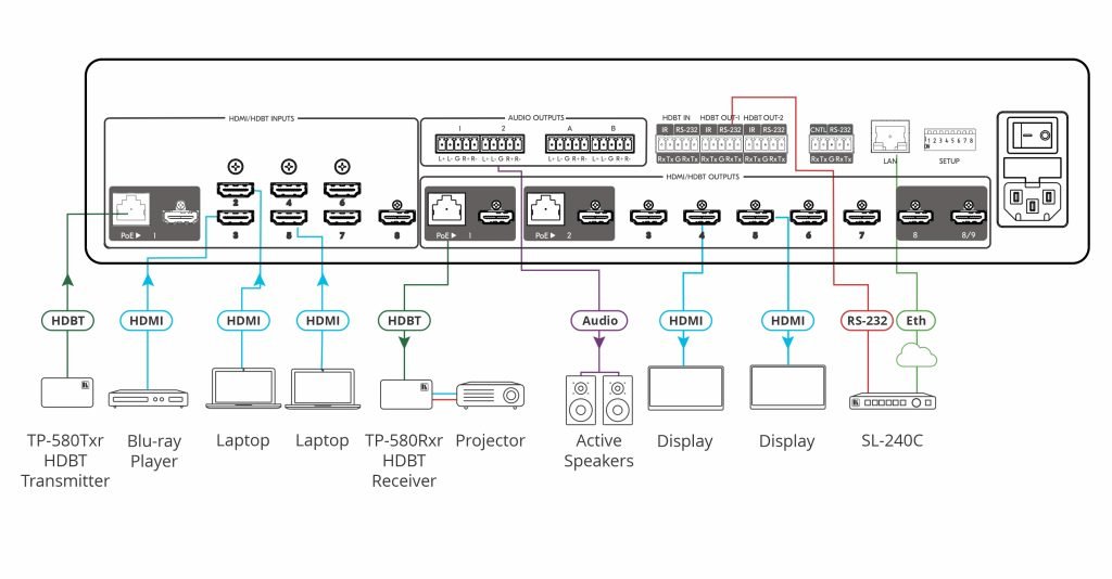 - HDBaseT. Questo standard semplifica i cablaggi su tratte estese e sostituiscei cavi HDMI, di controllo e di alimentazione. Sono disponibili un ingresso HDBaseT e due uscite HDBaseT speculari per visualizzare lo stesso contenuto su più monitor;