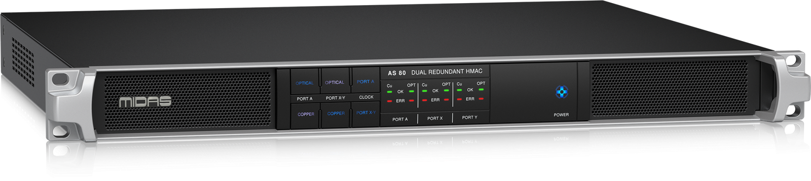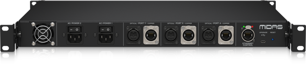 Midas AS 80 è progettato per convertire senza problemi una singola connessione HyperMac ad alto bitrate in due connessioni ridondanti da 1 GBit e viceversa, garantendo allo stesso tempo una commutazione audio ultraveloce. Inoltre, può gestire fino a 192 canali bidirezionali a 96 kHz.