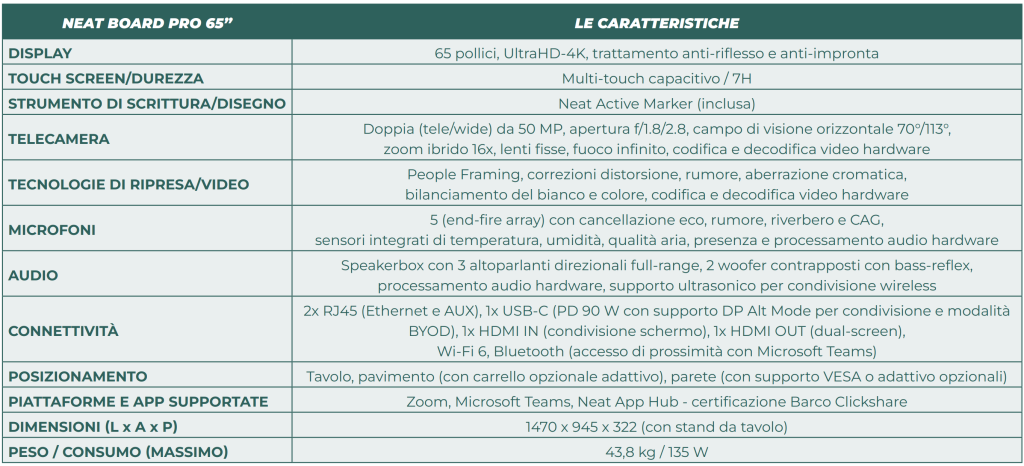 Il nuovo display AIO Neat Board Pro con LCD full-touch capacitivo UltraHD-4K da 65” include tutto il necessario per le attività collaborative (plug&play) come la doppia telecamera tele/wide da 50 MP, 5 microfoni in configurazione end-fire array e il supporto a Teams, Zoom, BYOD, Neat App Hub e Barco Clickshare.
