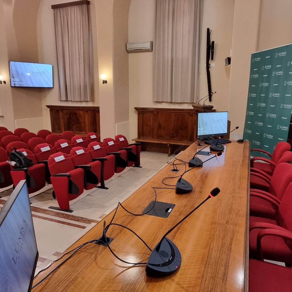 Con Vincenzo Lezzi proviamo a capire le esigenze alla base di questo recente intervento. «LUMSA è sempre impegnata a innovare la propria tecnologia, seguendo e a volte anticipando i più recenti trend nel campo dell’informatica, delle telecomunicazioni e della multimedialità. Nel nostro ateneo tutti gli spazi destinati a studenti e visitatori – aule, centri convegni, sale riunioni – offrono una dotazione multimediale. L’aula magna della sede di Palermo era stata rinnovata una decina di anni fa e c’era quindi bisogno di sostituire le tecnologie presenti. In più, avevamo l’esigenza di inserire alcune cabine per la traduzione simultanea, data la spinta che vogliamo dare agli eventi di respiro internazionale. In generale, la sfida era migliorare la qualità delle immagini e del sonoro, in modo che l’esperienza da remoto perdesse poco o nulla rispetto a quella in presenza.»