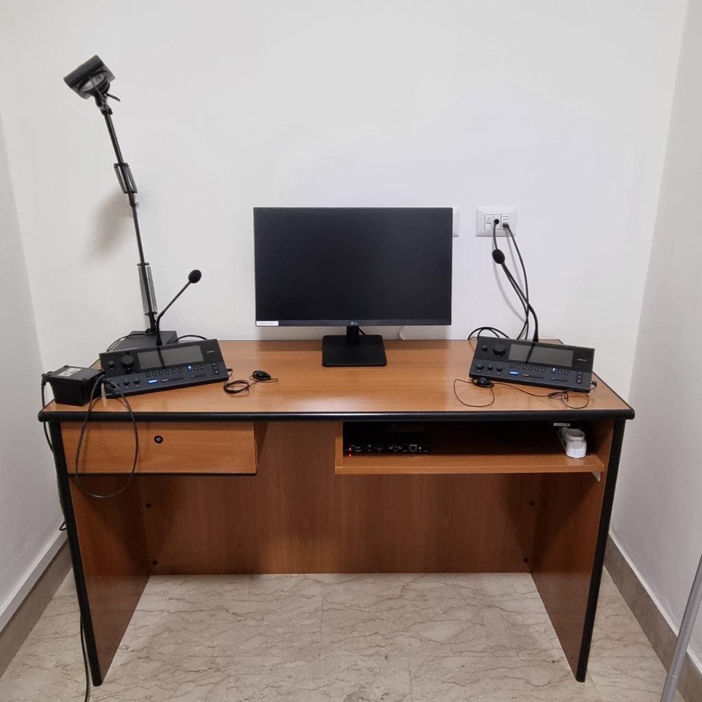 Il cablaggio è stato realizzato in HDBaseT con cavi Cat 6 perché non era possibile infilare i cavi HDMI nelle tubazioni; quindi, dal tavolo relatori, podio e postazione riservata ai laureandi i segnali raggiungono il processore Dexon, da cui escono verso i monitor LG da 65”, modello 65UH7F-H o il videoproiettore. Oltre a questi ultimi, nell’aula magna sono presenti 4 monitor da 24” LG, modello 24MP400P-B sul tavolo oratori, monitor dello stesso tipo per la regia e la traduzione simultanea e un PC per videoconferenza.