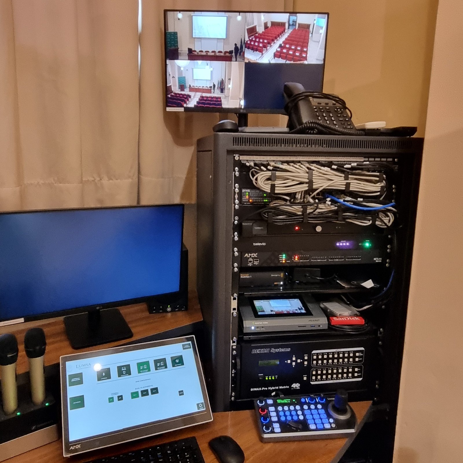 Lezzi commenta: «Le apparecchiature installate consentono a un tecnico in loco di commutare le sorgenti in ingresso dalla regia e stabilire su quale uscita video visualizzare un determinato contenuto. Oltre al telo da 3,5 metri di base per la videoproiezione, abbiamo infatti installato un monitor, su cui viene visualizzato ciò che accade in una videoconferenza remota. Sul telo – grazie al videoproiettore laser da 10.000 lumen – vediamo invece i lavori dell’aula».