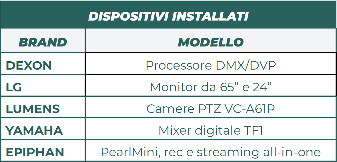 Il cablaggio è stato realizzato in HDBaseT con cavi Cat 6 perché non era possibile infilare i cavi HDMI nelle tubazioni; quindi, dal tavolo relatori, podio e postazione riservata ai laureandi i segnali raggiungono il processore Dexon, da cui escono verso i monitor LG da 65”, modello 65UH7F-H o il videoproiettore. Oltre a questi ultimi, nell’aula magna sono presenti 4 monitor da 24” LG, modello 24MP400P-B sul tavolo oratori, monitor dello stesso tipo per la regia e la traduzione simultanea e un PC per videoconferenza.