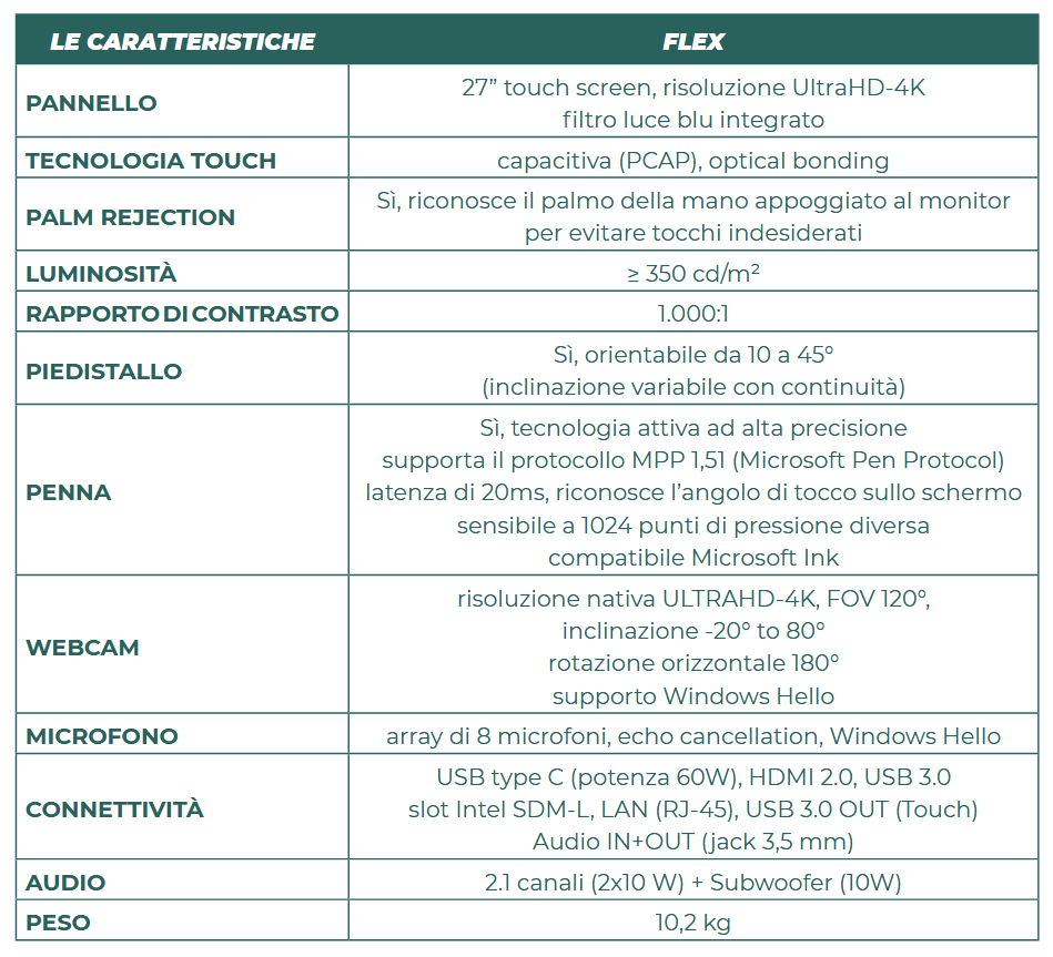 • Penna attiva ad alta precisione. La penna in dotazione a Flex è del tipo ad alta precisione, riconosce fino a 1024 punti di pressione diversa, ha una latenza di soli 20 ms e riconosce l’angolo di tocco sullo schermo; supporta il protocollo MPP 1,51 (Microsoft Pen Protocol) ed è compatibile Microsoft Ink;
