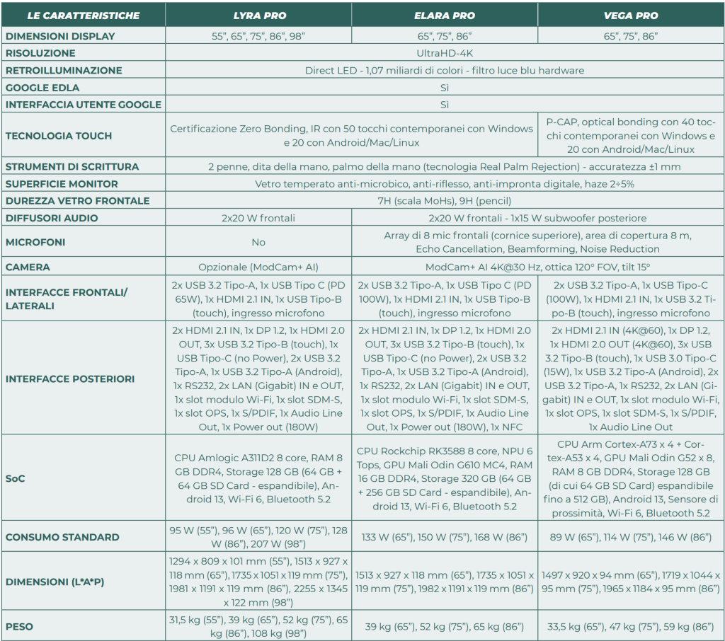 I monitor multitouch Newline Lyra Pro, Elara Pro e Vega Pro sono certificati Google EDLA e hanno preinstallate le app di Google Workspace e PlayStore. Sistema operativo Android 13 con SoC octa-core, da 8 a 16 GB di RAM e da 128 a 320 GB di storage. I modelli Elara Pro e Vega Pro integrano 8 microfoni e la ModCam+ 4K con AI.