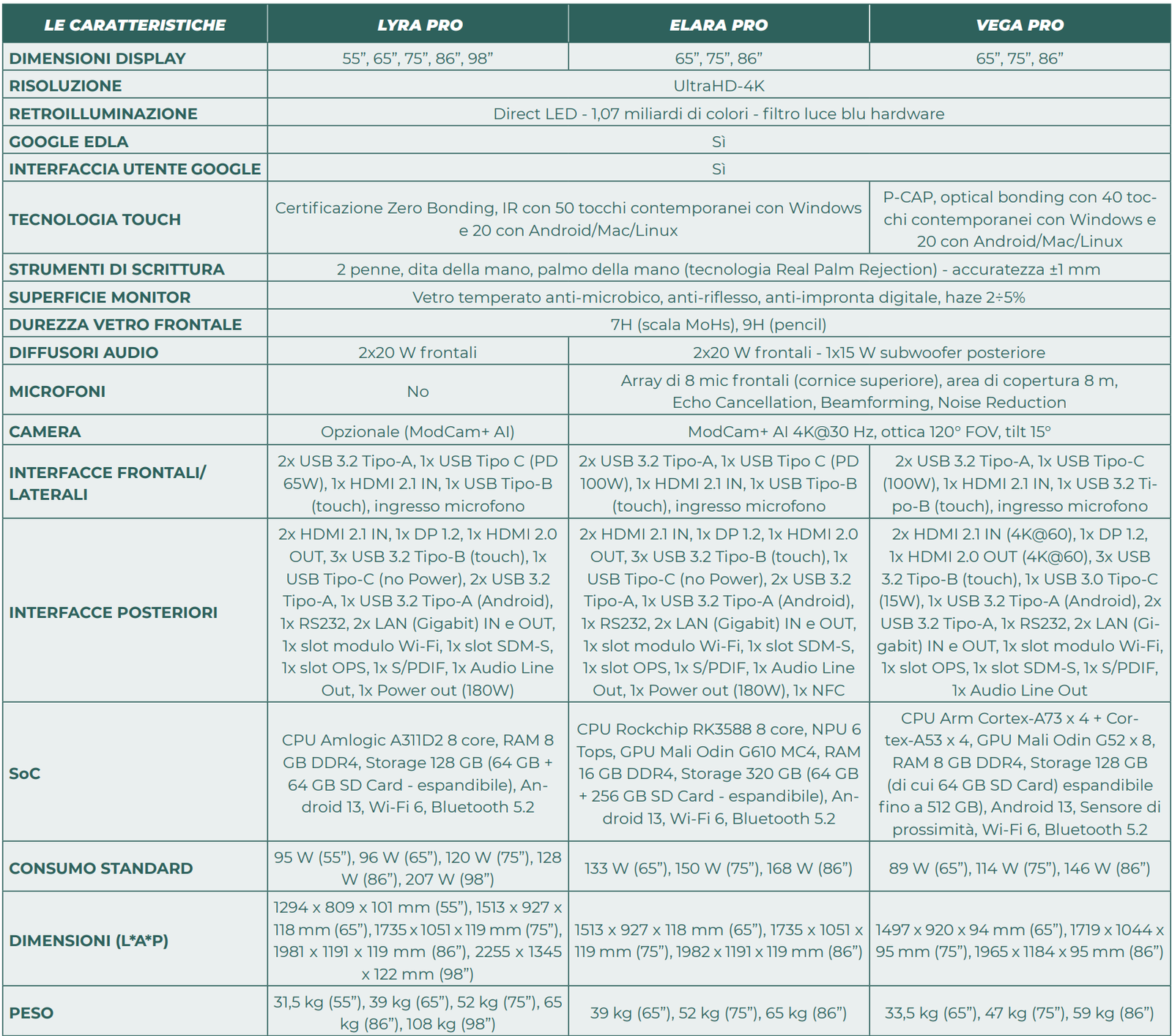 La famiglia di display interattivi Newline include i modelli Lyra Pro (55, 65, 75, 86 e 98 pollici), Elara Pro e Vega Pro (65, 75 e 86 pollici). Fra le prestazioni rilevanti, abbiamo: