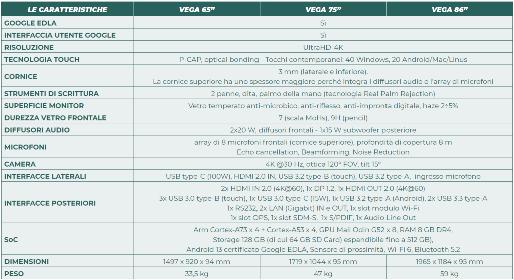 Le icone evidenziano alcuni dei punti di forza del nuovo Vega Pro. Alla certificazione Google EDLA si affianca Android 13 e un pannello touch ai vertici della categoria con il touch capacitivo e la tecnologia Optical Bonding. Importante anche la dotazione delle App gratuite e in opzione