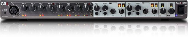 Il GR5 ha tutt’altra architettura perché i suoi connettori sono solo XLR e pin-jack, per due ingressi microfonici (con guadagno posteriore) e tre ingressi stereo linea, mentre le uscite sono 4 XLR bilanciati che possono essere raggruppate come due uscite stereo ed i cui volumi possono essere bloccati per evitare danni casuali. C’è una comoda matrice interna ed un circuito assistito da VCA oltre a circuiti di ducking e di mute. Infine questo modello può essere espanso con un ulteriore GR05 tramite connettore D-sub 25.