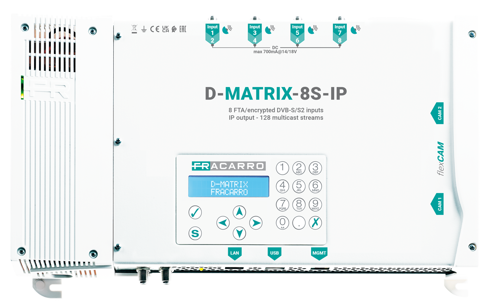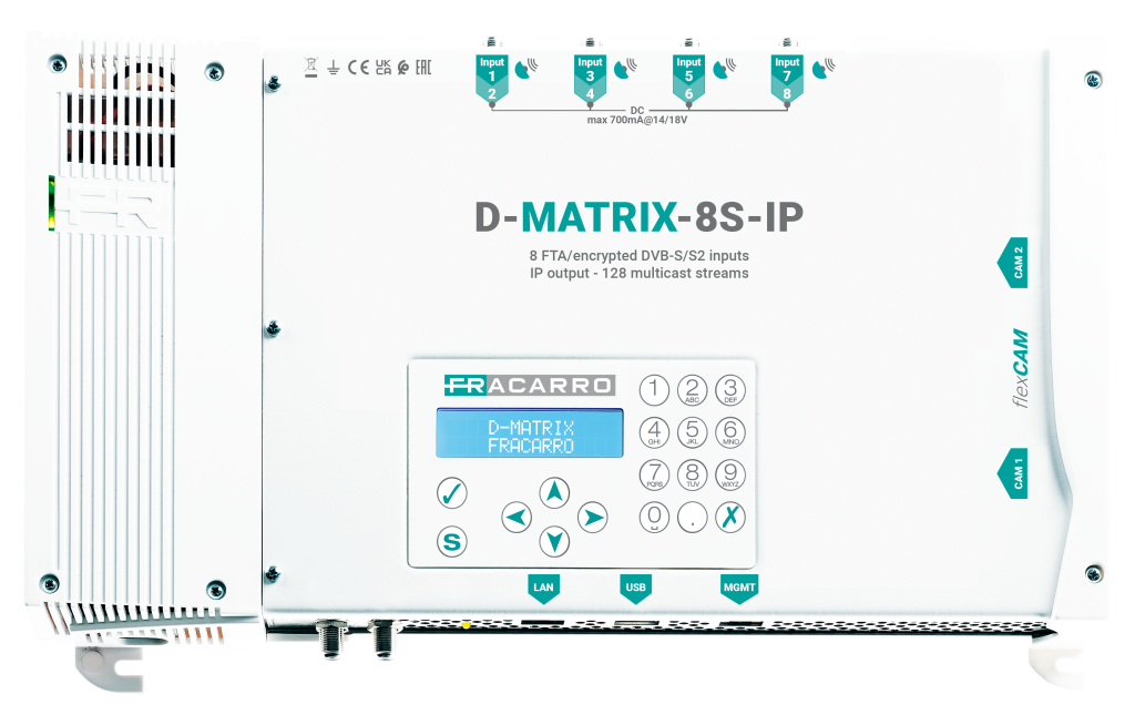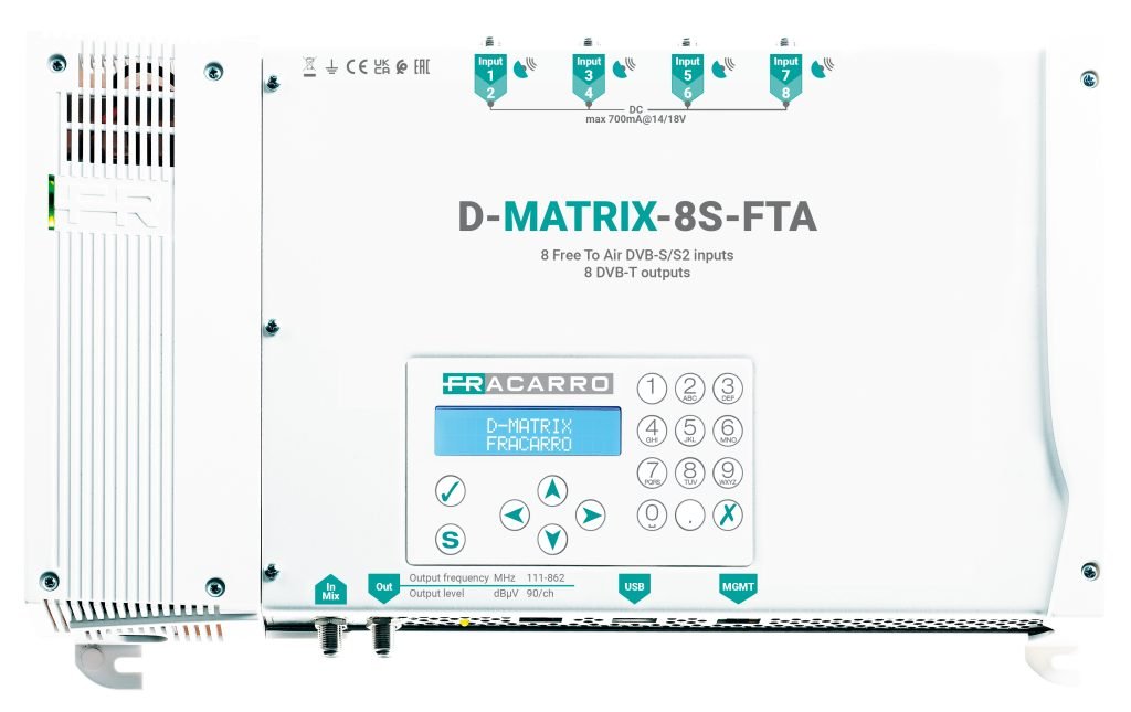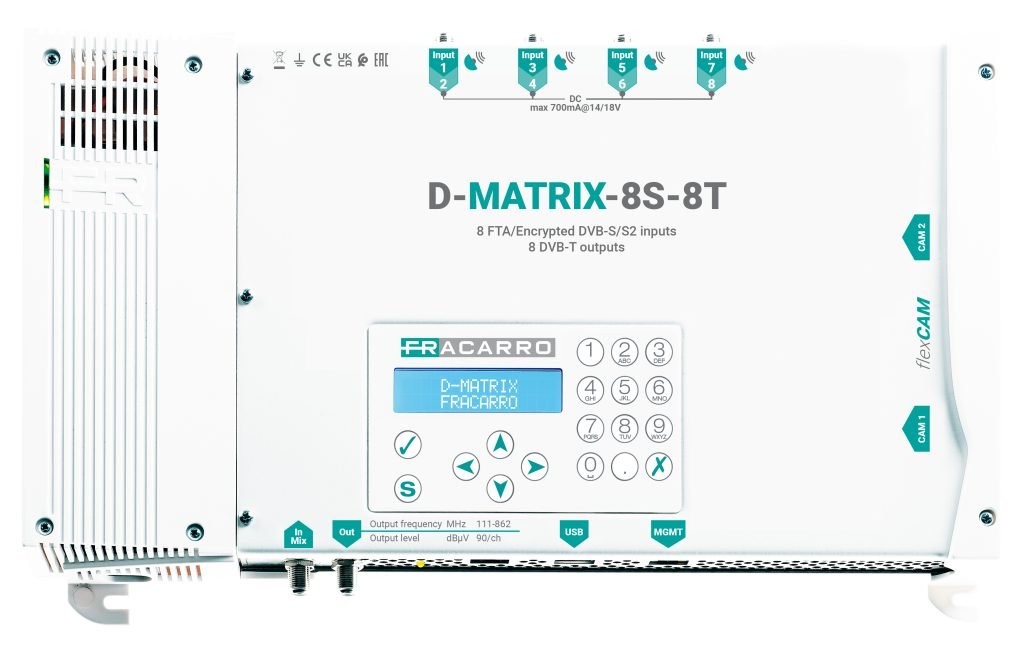 La nuova centrale D-MATRIX-8S-8T riceve i programmi HD o SD desiderati, codificati e free to air, da 8 diversi transponder satellitari indipendenti, rimodulandoli in uscita negli 8 multiplex digitali disponibili (COFDM).
