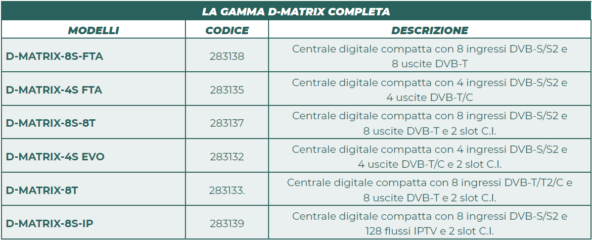 L’offerta comprende centrali di tipo modulare, adatte agli impianti di medie e grandi dimensioni, e modelli compatti come quelli della famiglia D-MATRIX, progettati per ricevere i contenuti satellitari o digitali terrestri provenienti da ingressi diversi e indipendenti, rimodulandoli su multiplex RF o flussi IP in uscita personalizzati.