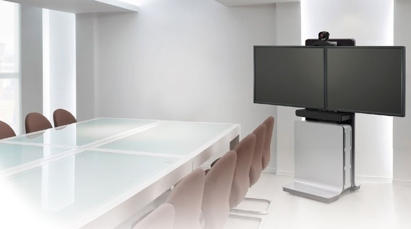 Il PFF 5100 ospita uno o due monitor in posizione orizzontale (landscape), oppure un monitor in verticale (portrait) per l’utilizzo come chiosco. Con la tecnologia Connect-it di Vogel Professional, che combina barre di sostegno e accessori per differenti applicazioni, si possono montare display di tutte le dimensioni, fino a 55 polllici. È prevista la presenza della webcam, integrata con un accessorio dedicato, e la sezione audio stereo di qualità, da 25W per canale. Sia la webcam che la sezione audio possono essere disposte sopra oppure sotto al display, anche in posizione laterale. Le robuste rotelle di cui è dotata la postazione, consentono di spostarla facilmente; il movimento, in opzione, può essere motorizzato.
