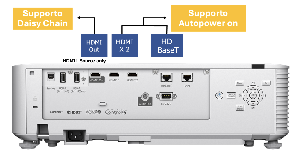 Doppio ingresso HDMI con supporto Daisy Chain – La connettività è stata rivista e ottimizzata per soddisfare le nuove esigenze. Oltre alle 3 porte HDMI (doppio ingresso e singola uscita per configurazioni loop/Daisy Chain) troviamo 2 prese RJ-45 (HDBase-T e LAN), 2 USB-A da 900mA (PC free) e 2A, l’uscita audio mini-jack e la porta seriale RS-232C.