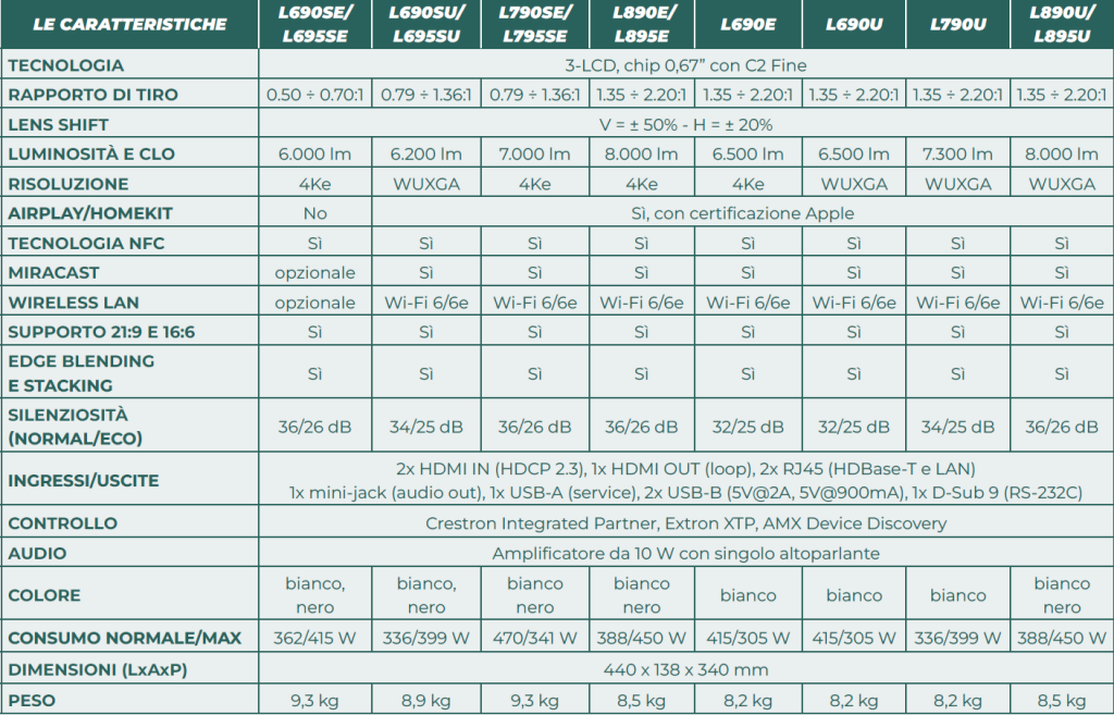 I modelli L790SE/795SE, L690SE/695SE (disponibili nei colori bianco e nero) sono anch’essi 4Ke mentre i modelli L690SU/695SU hanno una risoluzione WUXGA. In particolare, il modello L690SE/695SE (bianco e nero) è l’unico dotato di ottica a tiro corto (0.50÷0.70:1); con una luminosità di 6000 lumen è adatto per applicazioni museali, arte immersiva, simulatori sportivi, ecc.