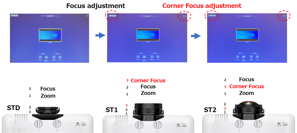 1. Lenti Short Throw con doppia regolazione del fuoco, lens shift V/H e zoom – I modelli con obiettivo short throw sono dotati di duplice messa a fuoco indipendente per ottenere il massimo dettaglio sia sui bordi sia al centro dello schermo, a tutto vantaggio della precisione e dell’immersività quando immagini grandi vengono visualizzate da vicino. Inoltre, queste ottiche, supportano anche il lens shift (±50% verticale, ±20% orizzontale) e lo zoom (1.4x/1.6x) per agevolare il posizionamento del videoproiettore.