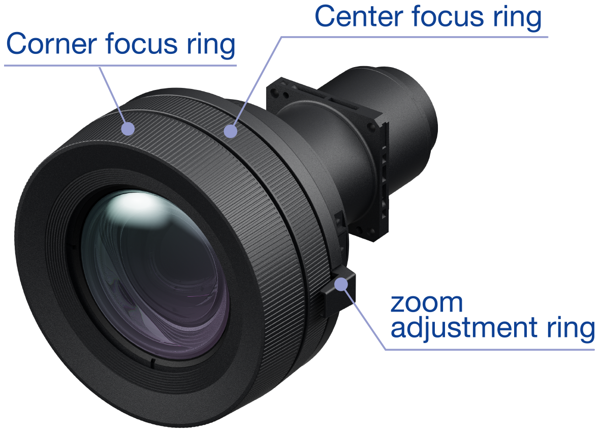 1. Lenti Short Throw con doppia regolazione del fuoco, lens shift V/H e zoom – I modelli con obiettivo short throw sono dotati di duplice messa a fuoco indipendente per ottenere il massimo dettaglio sia sui bordi sia al centro dello schermo, a tutto vantaggio della precisione e dell’immersività quando immagini grandi vengono visualizzate da vicino. Inoltre, queste ottiche, supportano anche il lens shift (±50% verticale, ±20% orizzontale) e lo zoom (1.4x/1.6x) per agevolare il posizionamento del videoproiettore.