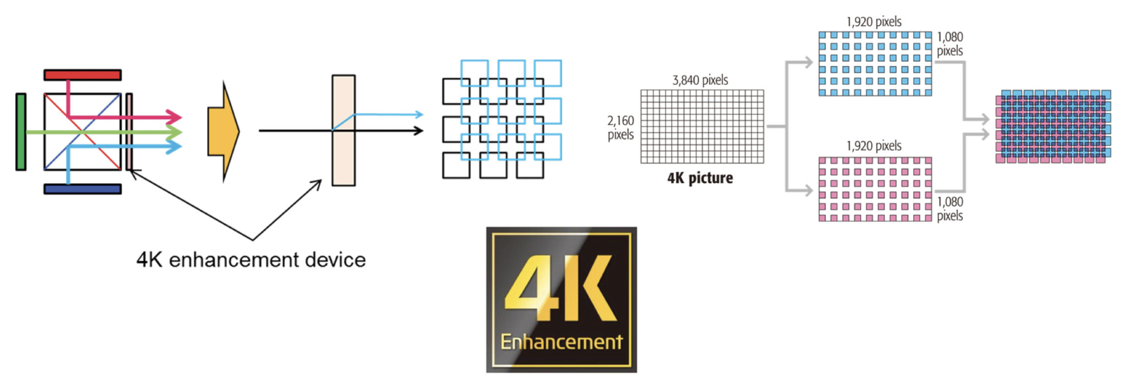 L’upscaling avviene grazie al pixel shifting, ovvero al microspostamento ultrarapido in diagonale della lente che raddoppia i pixel percepiti. Quando il proiettore rileva un segnale 4K in ingresso, l’elettronica suddivide l’immagine in due parti, raddoppia la frequenza verticale e proietta in sequenza le due parti simulando una proiezione 4K.