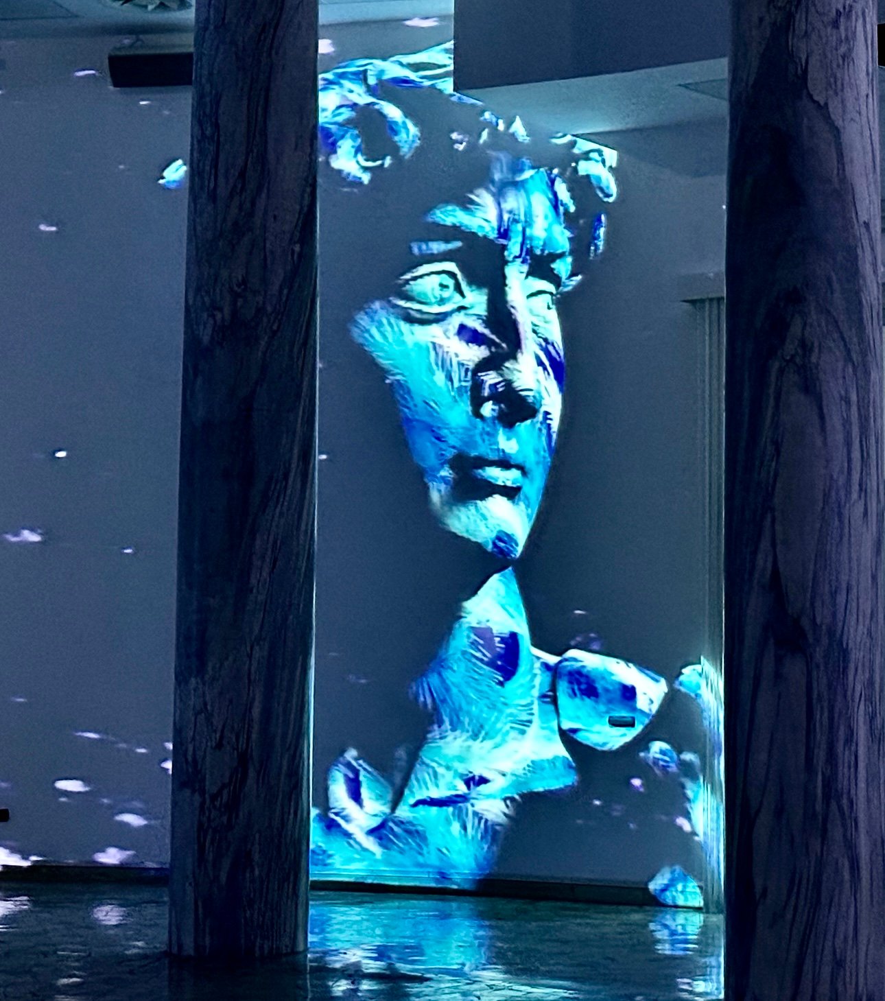 «Si tratta – ci spiega – di un’opera in cinque atti, ciascuno dedicato a un periodo della storia dell’arte: tardo medioevo; rinascimento; tardo romanticismo e impressionismo; Van Gogh e Munch; Kandinsky. I contenuti sono stati prodotti da Kif Italia con l’intento di offrire allo spettatore una nuova prospettiva sugli artisti trattati, senza però stravolgerli. Per esempio, nella parte dedicata a Michelangelo si è deciso di non riprodurre il David a figura intera, ma di proporre un primo piano del volto, che normalmente si trova molto più in alto rispetto a chi va ad ammirare la statua originale e difficilmente può essere osservato occhi negli occhi, con un simile grado di dettaglio. Un altro esempio è il lavoro fatto sull’Annunciazione di Leonardo: qui, invece di dare protagonismo alle figure in primo piano (l’angelo e la Madonna), la scelta è stata quella di mettere in risalto la città portuale che si trova sullo sfondo del dipinto e che, pur resa rarefatta da Leonardo con la sua caratteristica tecnica pittorica, è tuttavia piena di dettagli. Su tutto l’emiciclo viene riprodotta questa città portuale, che allo spettatore appare enorme».