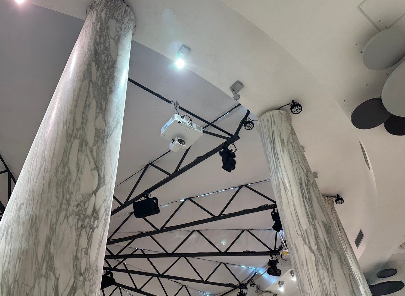 La nostra soluzione ha preso le mosse dalla scelta dei videoproiettori, sulla quale non abbiamo avuto dubbi: noi di Kif Italia, infatti, abbiamo avuto modo di sperimentare in diverse occasioni la qualità dei proiettori Epson e per le condizioni particolari del Salone delle Colonne abbiamo subito pensato al modello EB-PU2213 da 13.000 lumen, dotati di ottica ultracorta a collo di cigno. Per la proiezione circolare ne abbiamo utilizzati otto, posizionati a circa 6 metri d’altezza, agganciati alla struttura di metallo che sorregge il soffitto vetrato del salone. Questi proiettori hanno un software integrato che consente di fare una mappatura della superficie su cui proiettare e questo, in combinazione con un altro software estremamente versatile come Resolume Arena, ci ha permesso sia di gestire la proiezione su una parete curva sia di ottenere un mapping perfetto nonostante i vincoli che l’immobile ci imponeva dal punto di vista del posizionamento dei videoproiettori. Fondamentali in questo senso, vista anche la poca distanza dalla parete di proiezione, le ottiche ultracorte a collo di cigno (modello ELPLX02WS): sono ottiche dotate di lens shift motorizzato, cosa che raramente capita con le ultracorte».