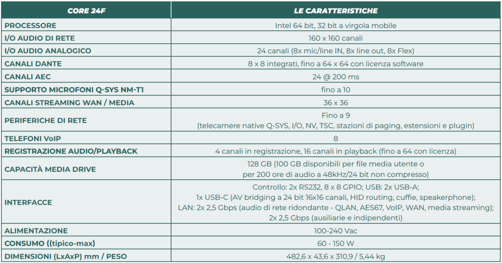 Core 24f è il processore Q-SYS di nuova generazione, potente e scalabile: 160×160 canali audio di rete, 24 audio integrati e 8×8 Dante gestiti dalla piattaforma Q-SYS Full Stack AV per installazioni di piccole e medie dimensioni che richiedono l’elaborazione dei segnali in-room.
