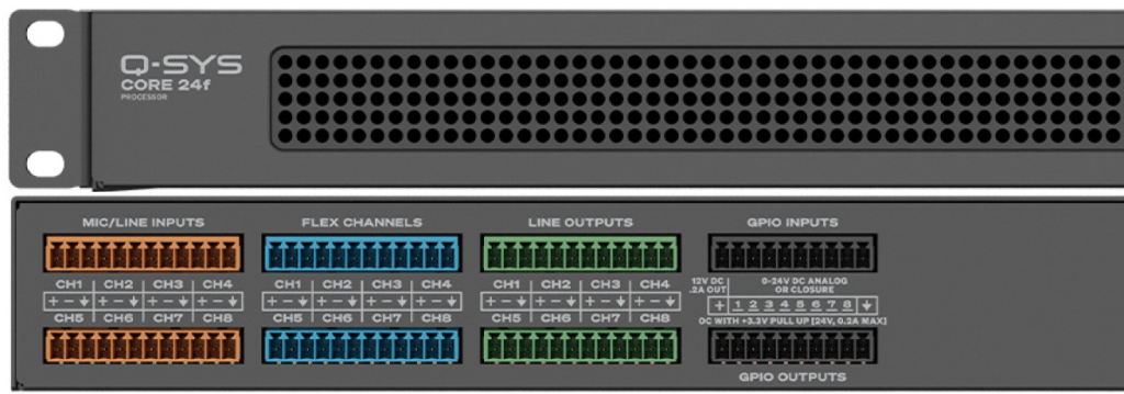 2. 24 canali audio fissi e configurabili – Il nuovo processore Q-SYS include otto ingressi microfono/linea analogici fissi, otto uscite di linea analogiche fisse e otto canali I/O Flex analogici, configurabili via software come ingressi o uscite linea per singolo canale, così da adattare la matrice al progetto senza hardware aggiuntivo.
