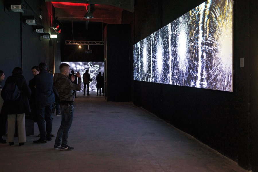 Le videoproiezioni irrompono da più direzioni, creano uno spazio multisensoriale che si va ad integrarsi con le altre installazioni.