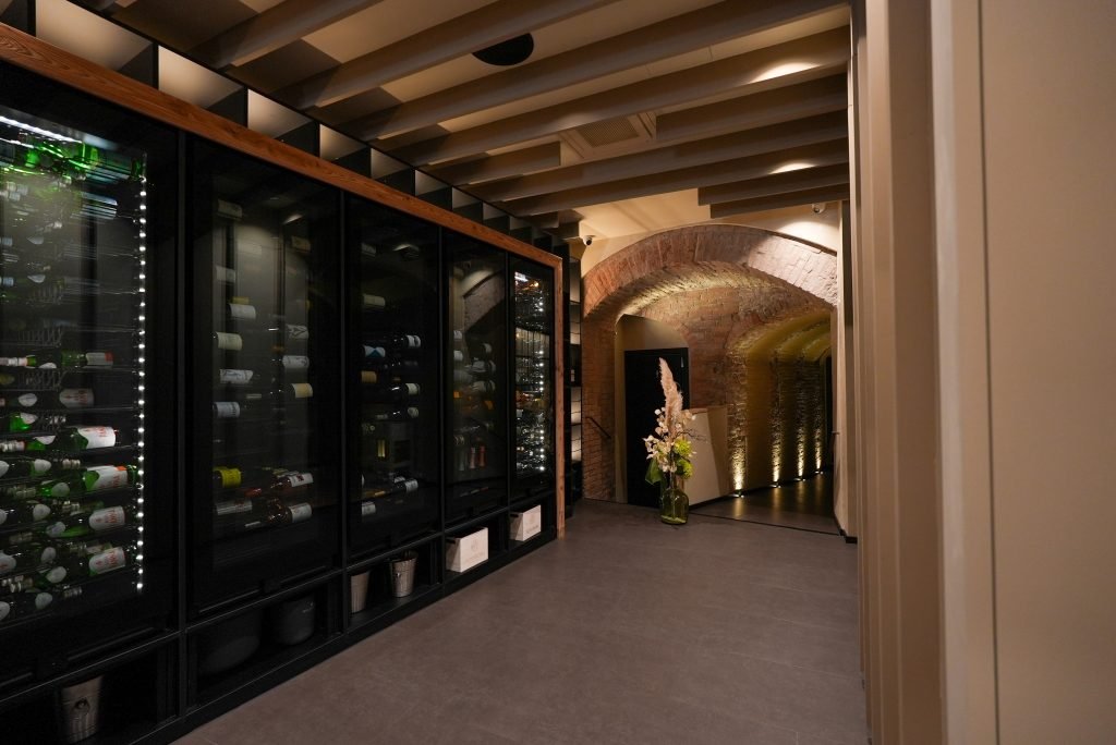 Infine, è proprio il caso di dire “dulcis in fundo”, tramite una scala chiocciola si arriva nella cantina, con vini importanti. Questa sala esclusiva, anch’essa amplificata, può essere riservata per un momento conviviale che può coinvolgere fino a dodici persone. A rendere ancor più suggestivo il tutto, la presenza di un pozzo profondo 15 metri, naturalmente dotato di grata protettiva.