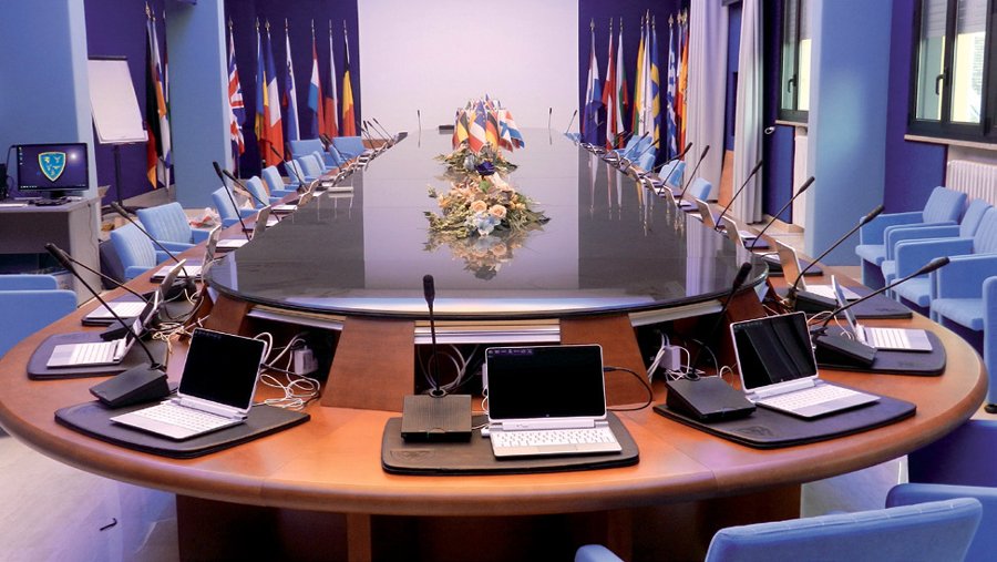 «Innanzitutto, ad ogni posto è stato associato un microfono per poter prendere la parola e interloquire in qualsiasi momento con i presenti in sala – ci spiega l’Ing. Morigi. Inoltre, ogni postazione presente attorno a questo immenso tavolo di lavoro, 36 in tutto alle quali si aggiungono 2 scrivanie per i PC di controllo della sala, è stata predisposta con un PC collegato con cavo HDMI ad un sistema di commutazione e trasmissione, celato sotto al tavolo. Un pulsante grigio, posto vicino al PC, se premuto una singola volta, permette di mandare sui monitor e sul videoproiettore l’immagine del PC scelto. Con la stessa metodologia, ma tenendo premuto il pulsante per tre secondi, si esclude lo stesso PC dalla trasmissione. Durante la riproduzione dei contenuti di un PC, è possibile intervenire da un’altra postazione, premendo il relativo pulsante grigio che automaticamente interrompe il precedente interlocutore».