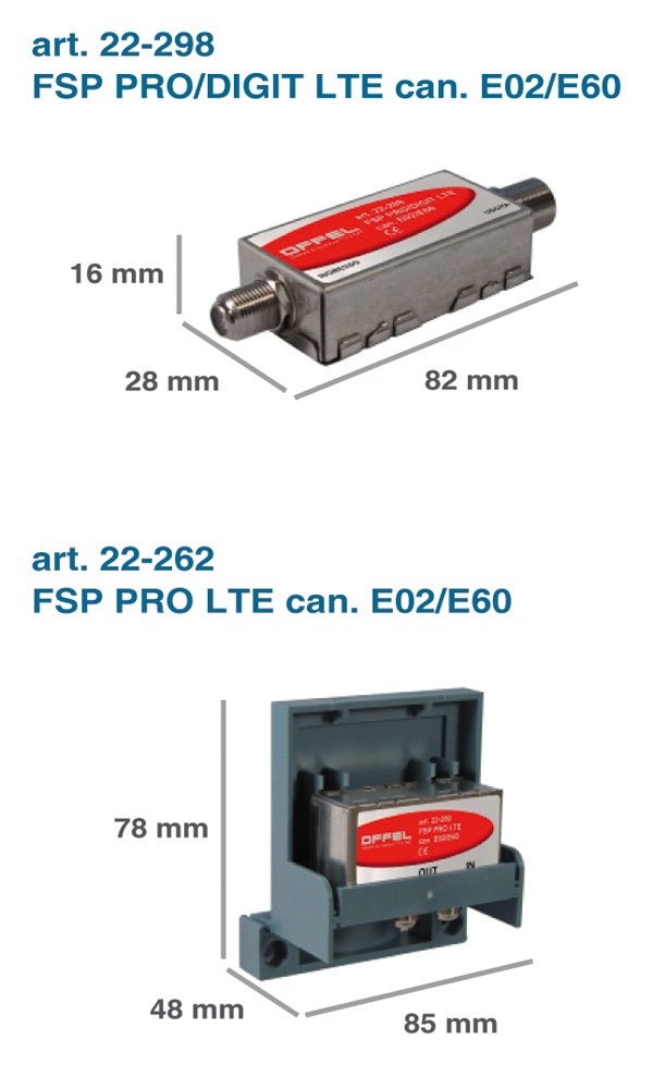 Questi filtri larga banda sono in grado di preservare i canali televisivi, dal canale E02 al canale E60, attenuando le frequenze al di sopra dei 790 MHz, destinate ai servizi di telefonia mobile a standard LTE, il cosiddetto 4G. I filtri passa banda serie FSP PRO LTE sono disponibili nelle versioni per esterno (art. 22-262 FSP PRO LTE canali E02÷E60) e per interno (art. 22-298 FSP PRO/DIGIT LTE canali E02÷E60). Entrambi i modelli sono dotati di connettori F a vite. La versione per interno viene realizzata con connettori ad innesto rapido, per effettuare un’installazione ancora più semplice e veloce.