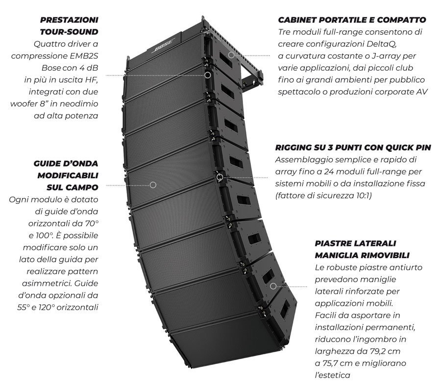 – Livello di uscita tour-sound. 4 driver Bose EMB2S a compressione, migliorati sulle alte frequenze, e 2 woofer da 8” ad alta potenza, al neodimio, che forniscono un SPL di picco fino a 145 dB.