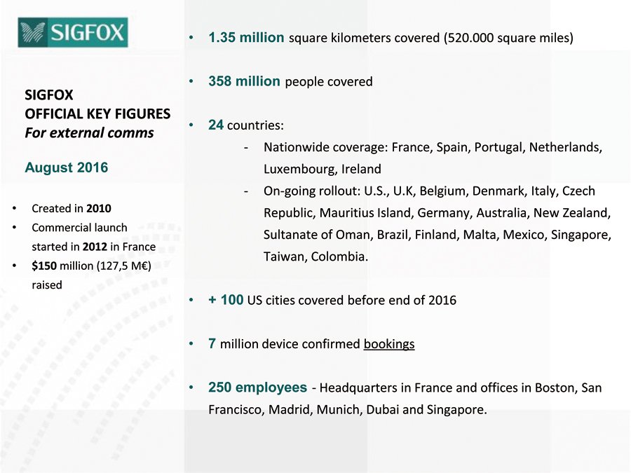 SIGFOX offre un servizio di comunicazione globale, dedicato all’IoT (Internet delle Cose) e all’M2M (Machine2Machine), con una rete specifica per non saturare le reti esistenti, dedicate principalmente a PC e Smart Device.
