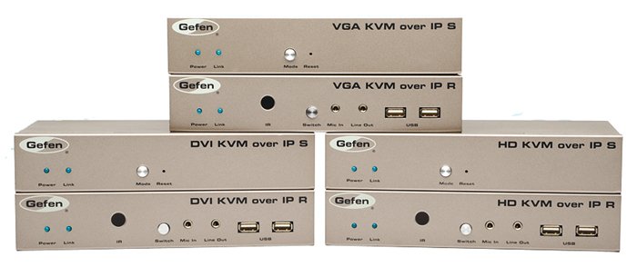 Ogni soluzione è composta da un trasmettitore e da un ricevitore. Sono disponibili soluzioni per segnali VGA, DVI e HDMI, queste ultime due interfacce sono anche dotate di compatibilità HDCP. Gli unici requisiti richiesti sono alla portata di tutti: basta una rete Gigabit con supporto JumboFrame da almeno 8K. Oggi gli switch più economici offrono queste caratteristiche ma, in ogni caso, è possibile creare un’infrastruttura anche utilizzando lo switch integrato nell’unità ricevitore Gefen. La natura della rete ethernet annulla infine il concetto di distanza massima: grazie all’introduzione di apparati attivi (switch) o di transceiver rame-fibra sarà possibile estendere la rete ethernet senza limitazioni e senza implicazioni nella distribuzione dei segnali video.