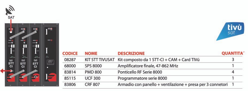 Un sistema modulare e professionale per ricevere i programmi Sat da distribuire in strutture pubbliche e private come: condomini, alberghi, Villaggi turistici, Ospedali ecc. Prevista una configurazione specifica per Tivùsat.