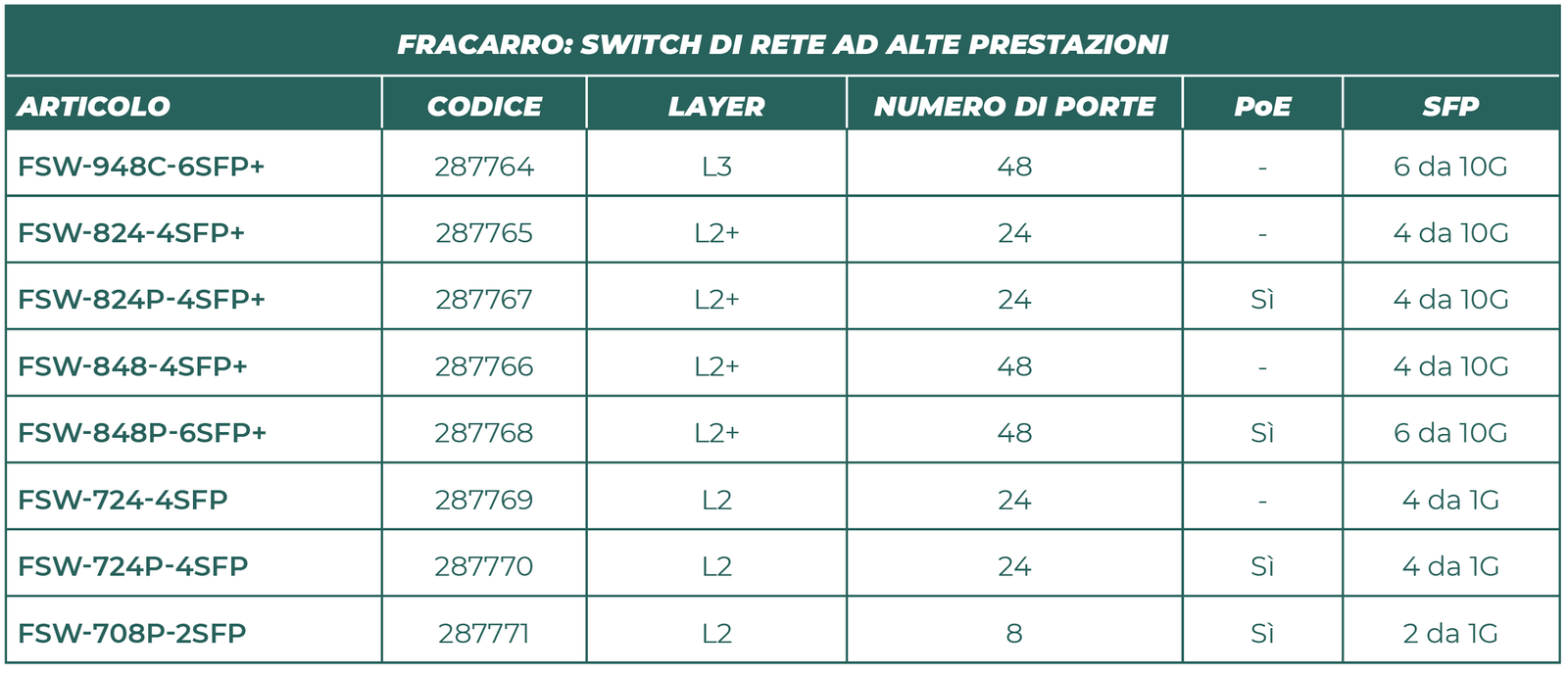 Anche questi dispositivi, grazie al supporto del protocollo multicast IGMP Snooping, consentono di gestire il traffico IPTV e sono dotati di porte SFP a 1 giga Ethernet per il collegamento fino a 4 uplink. La serie è disponibile in tre versioni, a 24 porte (FSW-724-4SFP), 24 porte PoE (FSW-724P-4SFP) e, per i sistemi di dimensioni inferiori, a 8 porte PoE.