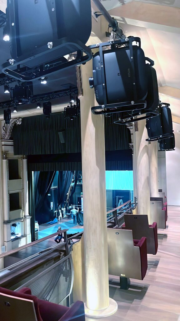 Molteplici modelli di ottiche – Questi proiettori hanno l’ottica intercambiabile. «Abbiamo usato ottiche grandangolari per il pavimento e standard per il perimetro del teatro» precisa De Rosa. Non sono state considerate le ultracorte né quelle a specchio, per garantire uniformità di luminosità e messa a fuoco sull’intera proiezione, assicurando una resa stabile e coerente in ogni dettaglio visivo.»