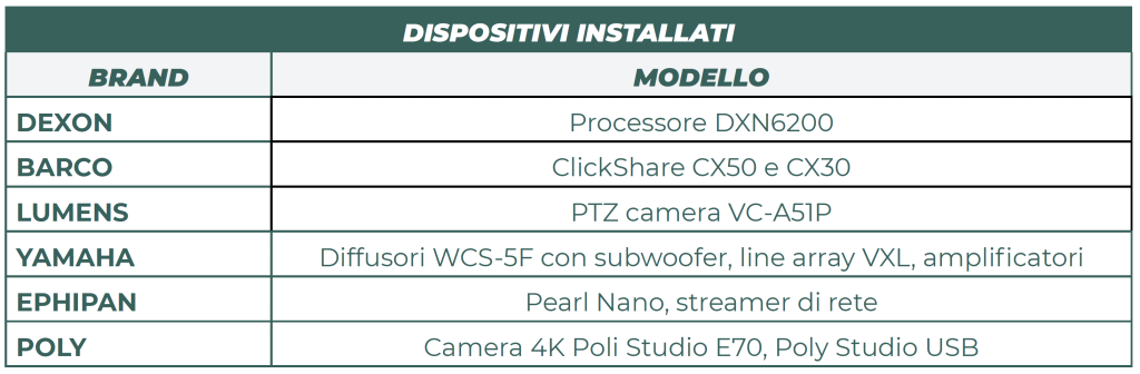 «Abbiamo costruito un’architettura complessa – ci dice – allo scopo di ottenere una user experience semplice. Il tavolo dei relatori e il podio sono mobili e, insieme al produttore degli arredi, abbiamo ingegnerizzato dei pozzetti di collegamento posizionati a pavimento, per collegare facilmente tutti i device presenti.