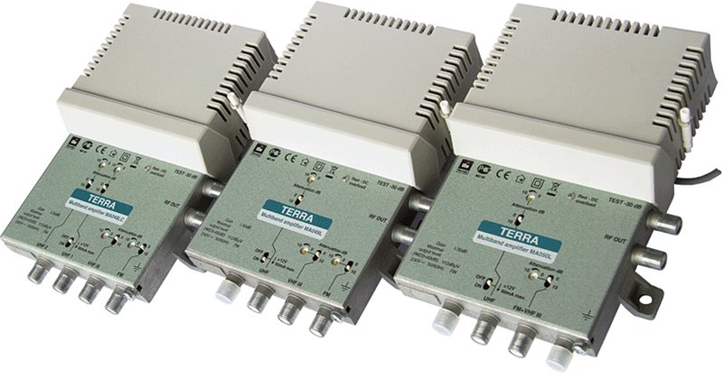 Terra ha da poco messo in commercio la nuova gamma di centralini compatti MA, con contenitore in pressofusione e ingressi UHF tagliati a 799 MHz e 766 MHz. Sei modelli a bande separate, progettati per amplificare e miscelare i segnali da due, tre o quattro antenne. Tutti sono equipaggiati con filtro di soppressione dei segnali LTE, provvisti di protezione e indicazione dei sovraccarichi in c.c., di attenuatori del segnale per ogni ingresso e di telealimentazione di preamplificatori o antenne attive. I guadagni sono: 30 dB in VHF e UHF per il modello MA058; 30 dB in VHF e 34 dB in UHF per i modelli MA048L, MA049L, MA050L, MA072 e MA073. E’ presente uno switch 0/10 dB per usarli anche come amplificatori da 20 dB.